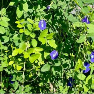 バタフライピーが美しく咲いて、鮮やかな青色が人目を惹いています。通りかかる人が「ええ色じゃなあ。」「いっつも見ようるで。」と言って下さるので嬉しくて。葉っぱも可愛らしく涼しげで、つるも軽やかで本当にス